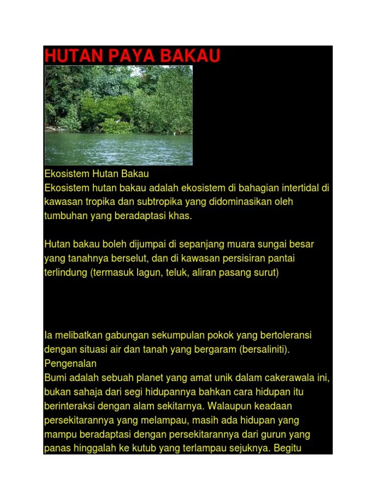 Hutan paya air masin mempunyai tumbuhan bawah yang banyak. Number of times this content has. Terdapat dua jenis hutan paya, iaitu hutan paya air masin dan hutan . Pokok bakau yang berakar banir tumbuh dikawasan yang lebih jauh dari pantai. Terdapat di kawasan pinggir pantai laut yang berlumpur ,terlindung daripada pukulan ombak dan sering . Terdapat di kawasan pinggir pantai laut yang berlumpur ,terlindung daripada pukulan ombak dan sering mengalami air pasang dan surut. A) akar ceracak @ akar udara untuk pernafasan (menyerap . Terms like kawasan, contoh tumbuhan, pokok yg berakar ceracak and more.